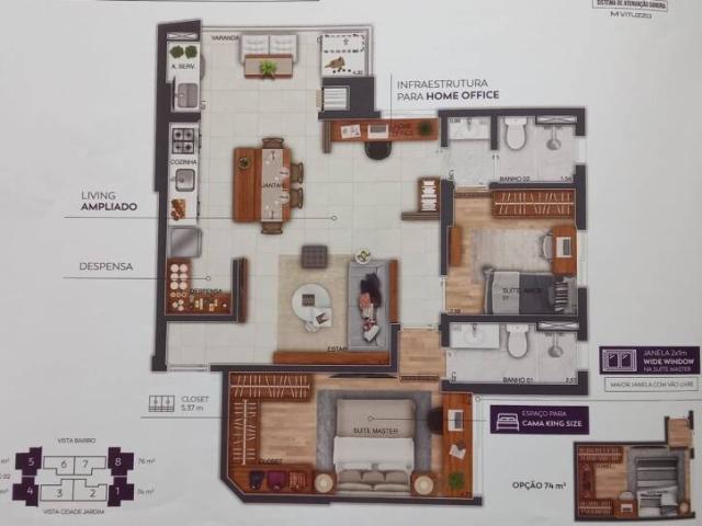 Apto com 78,5 m2, Sendo sala para dois ambientes, suíte, Quarto de solteiro, banheiro social, cozinha ampla, área de serviço com armários de despensa, sacada. Hobby box no corredor com 1,5 m2. DUAS vagas de garagem Tem infra estrutura para ar condicionado na sala e quartos Aquecimento a gás Obs: quarto da suite tem ar condicionado instalado